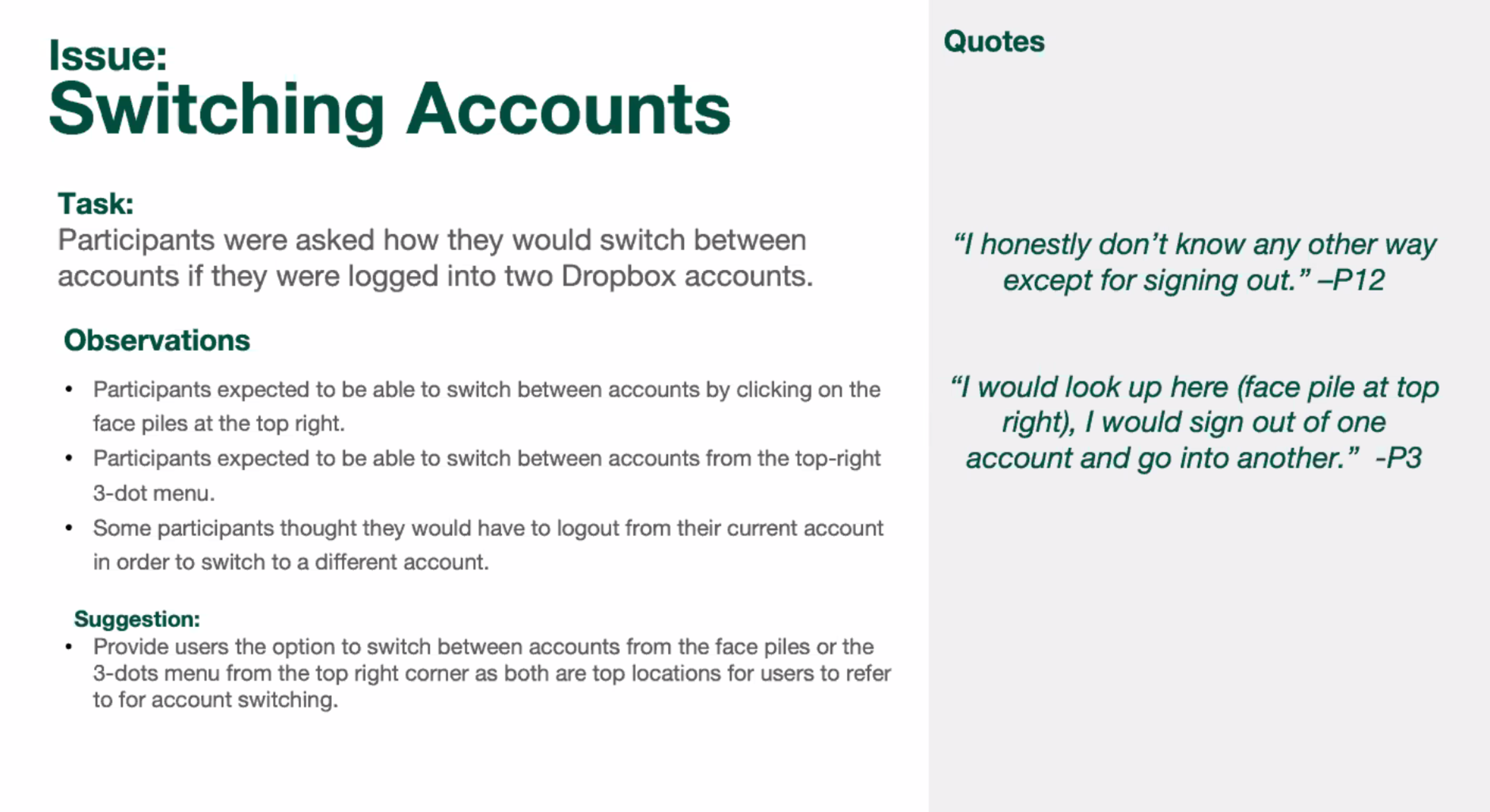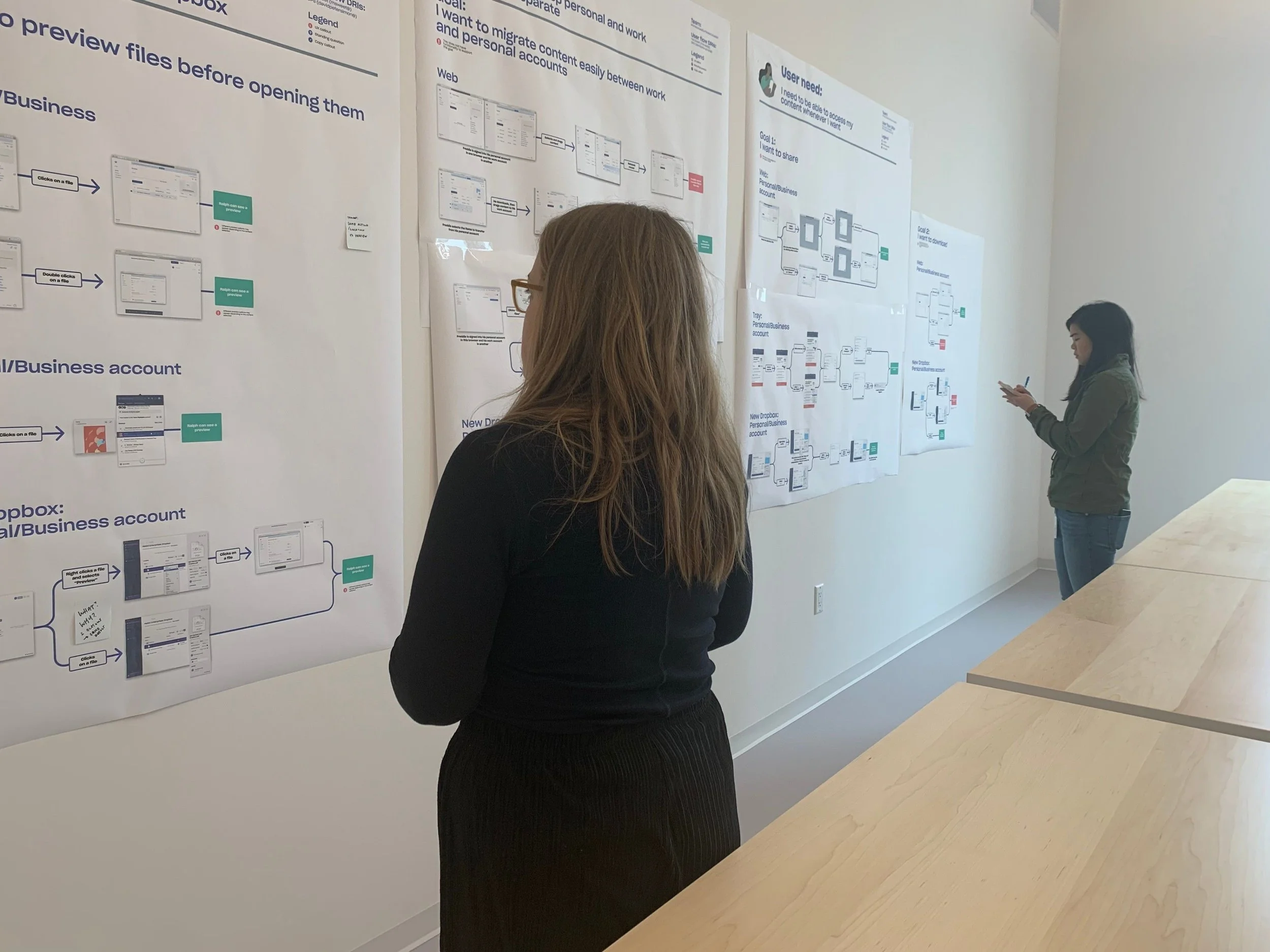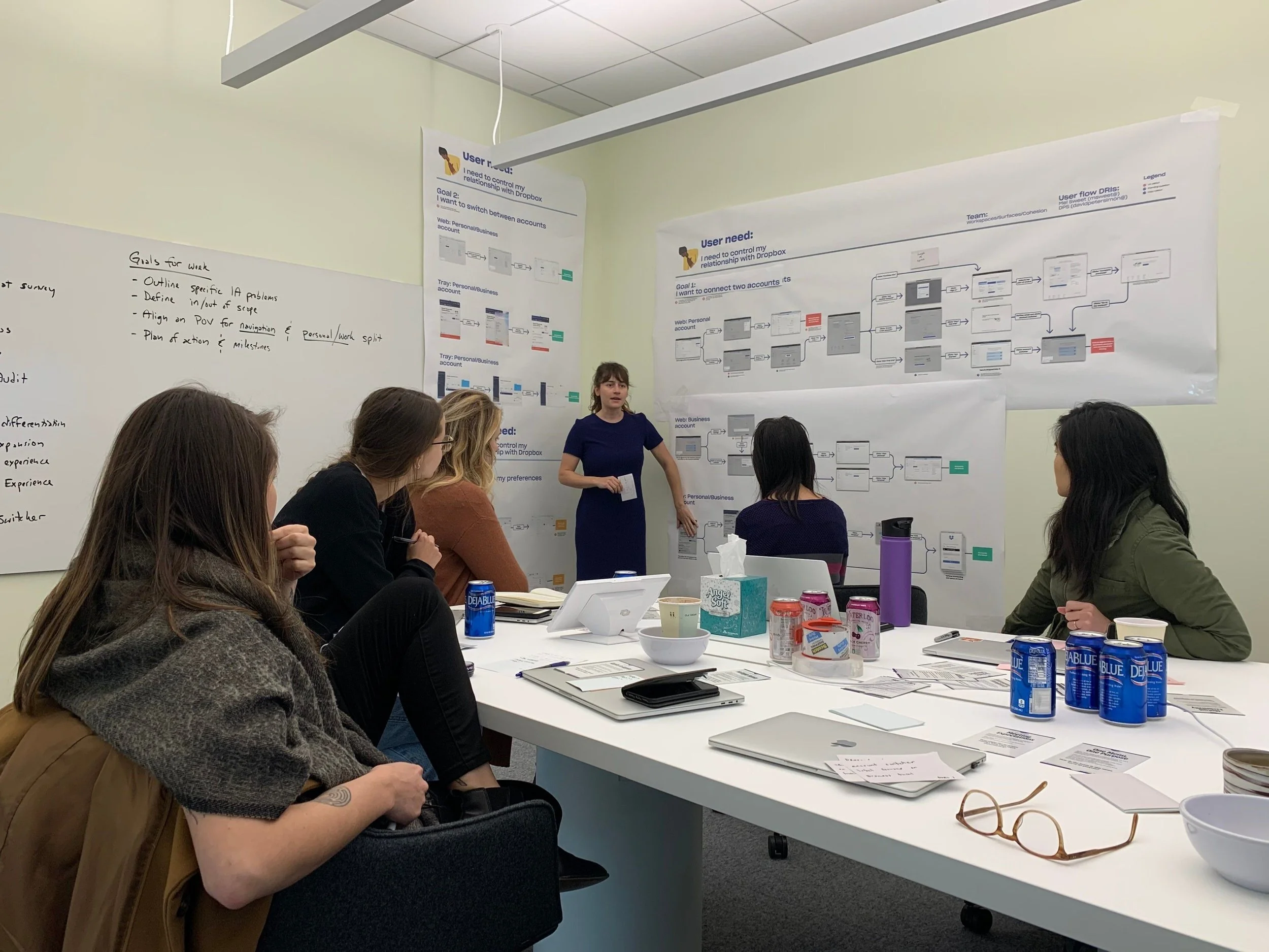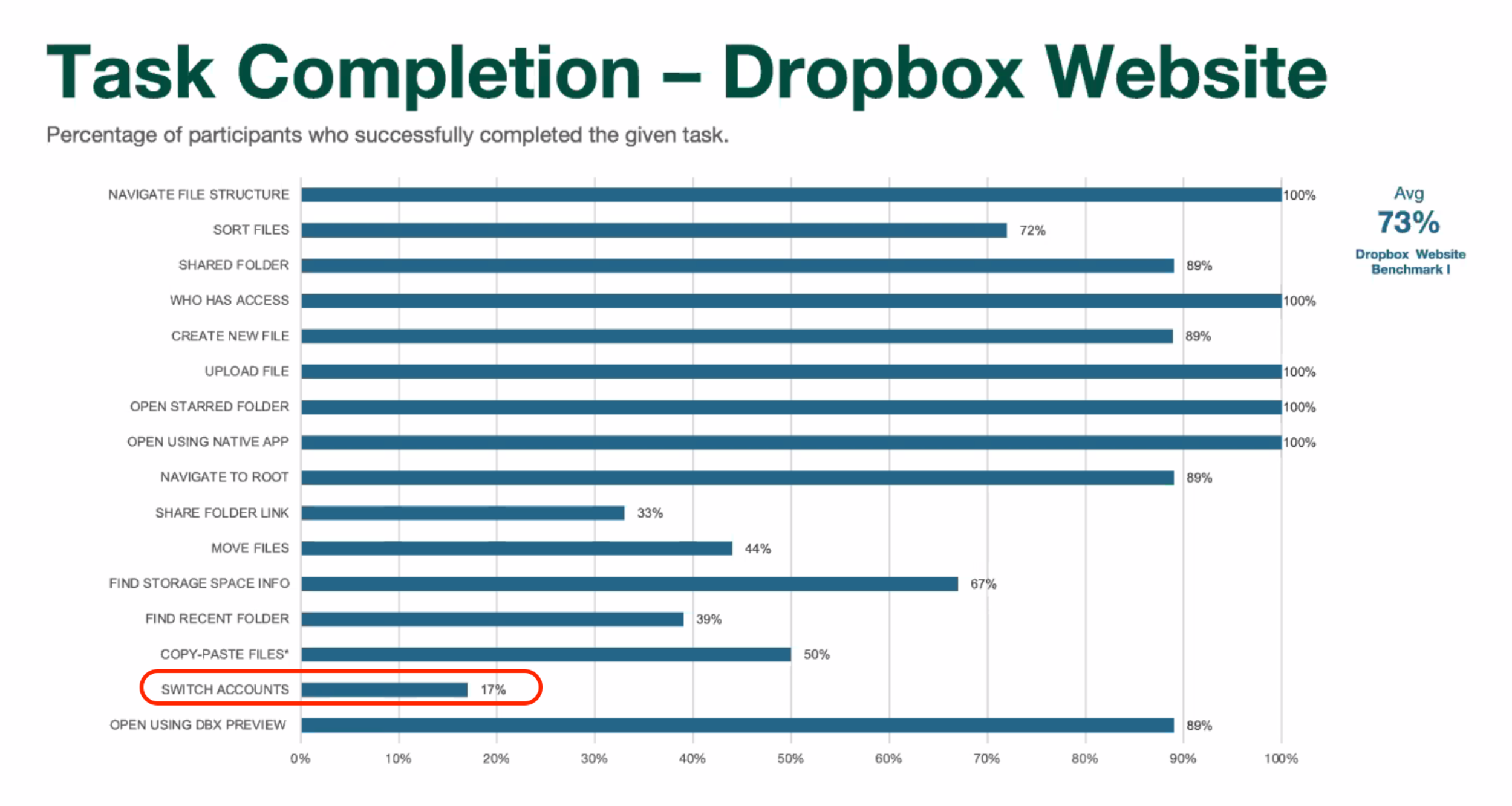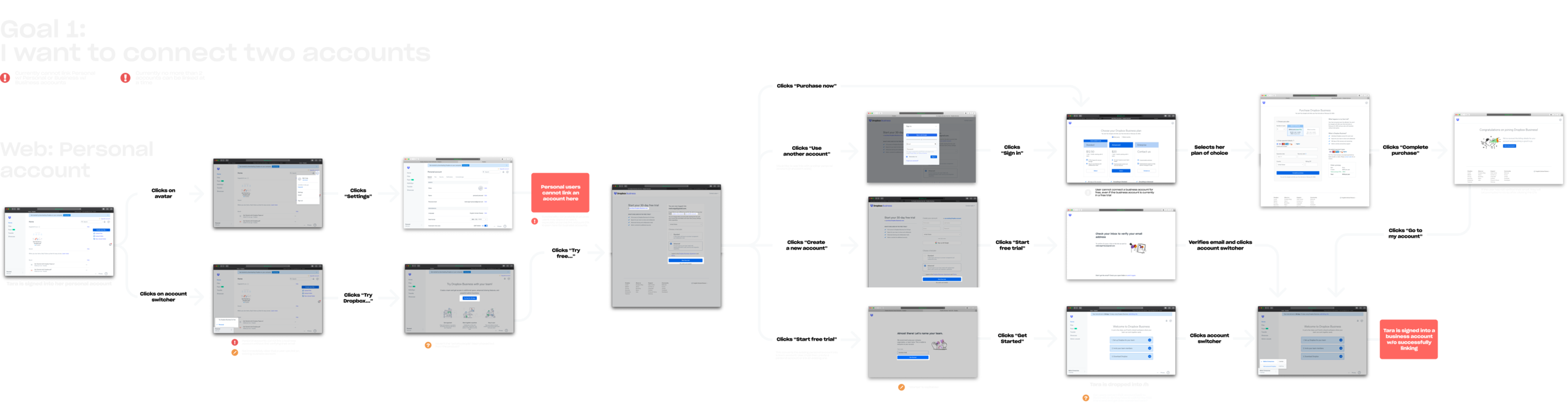 After the cross-functional meeting my Product partner and I needed to further prioritize what would be on our roadmap. To get there I cross-checked my user flow findings with the Customer Experience team’s “big ticket issues” report as well as our Data Analytics team’s information around task completion rates. These teams echoed two main areas of frustration: users were not able to find their account info across Dropbox surfaces, and connecting two dropbox accounts together was the task with the lowest completion rate.