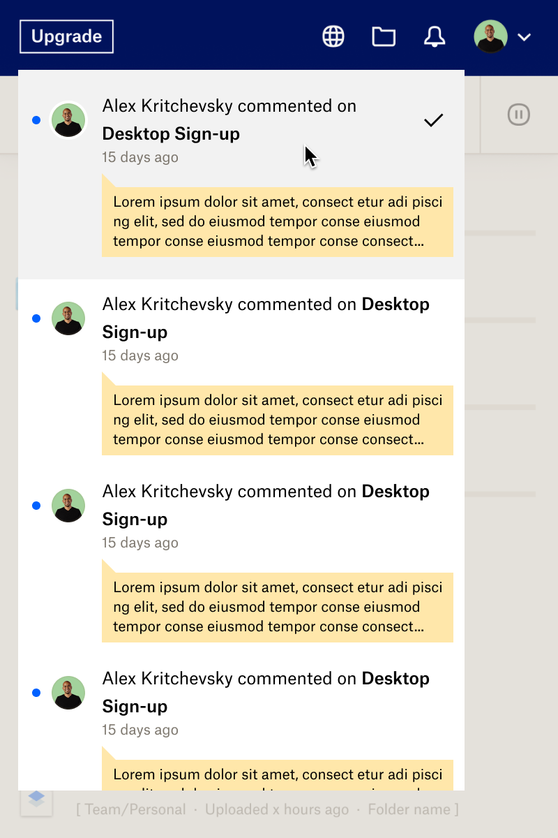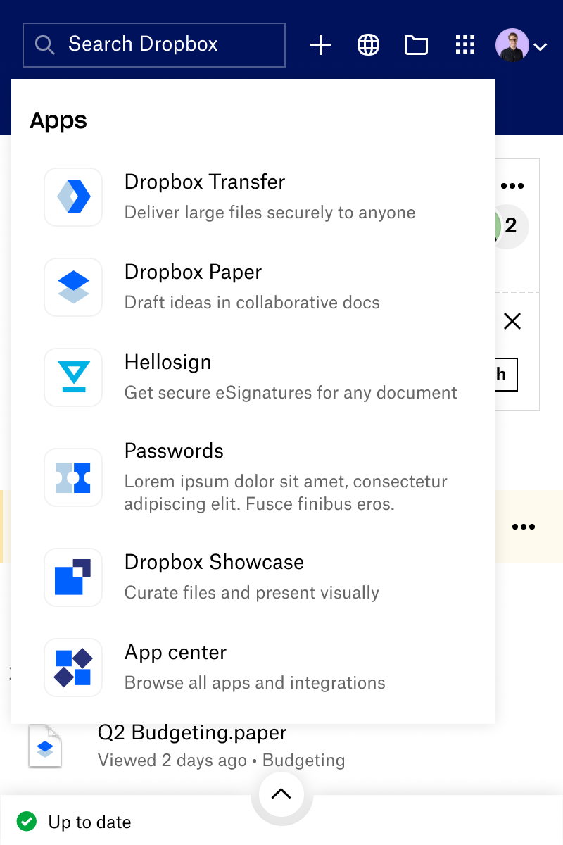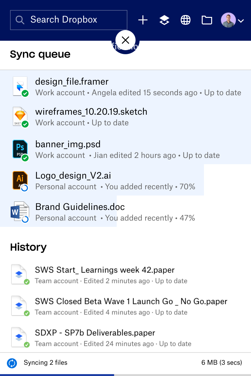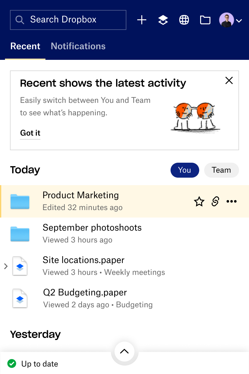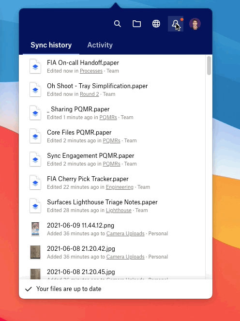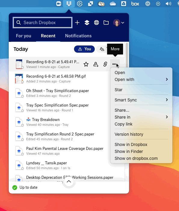 The current Tray (a Dropbox surface accessible via a computer’s system menu bar) was previously designed to complement the release of our desktop app in fall 2019. The main addition to the tray was a set of smart and assistive features, driven by the desire to make intelligence the “DNA of the product”.