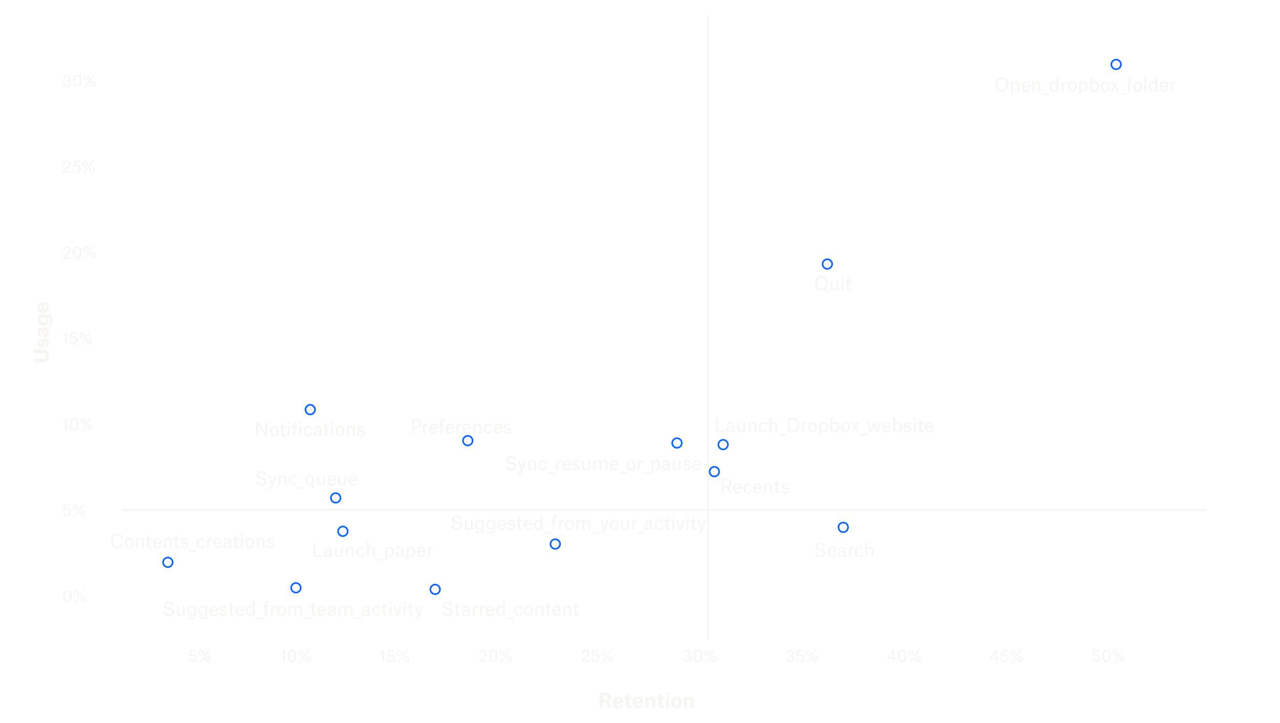 I also took a look at the usage of each Tray feature in comparison to user retention in order further test my hypothesis. Everything in the 4th quadrant below has both low usage and low retention, and was easy to justify removing.